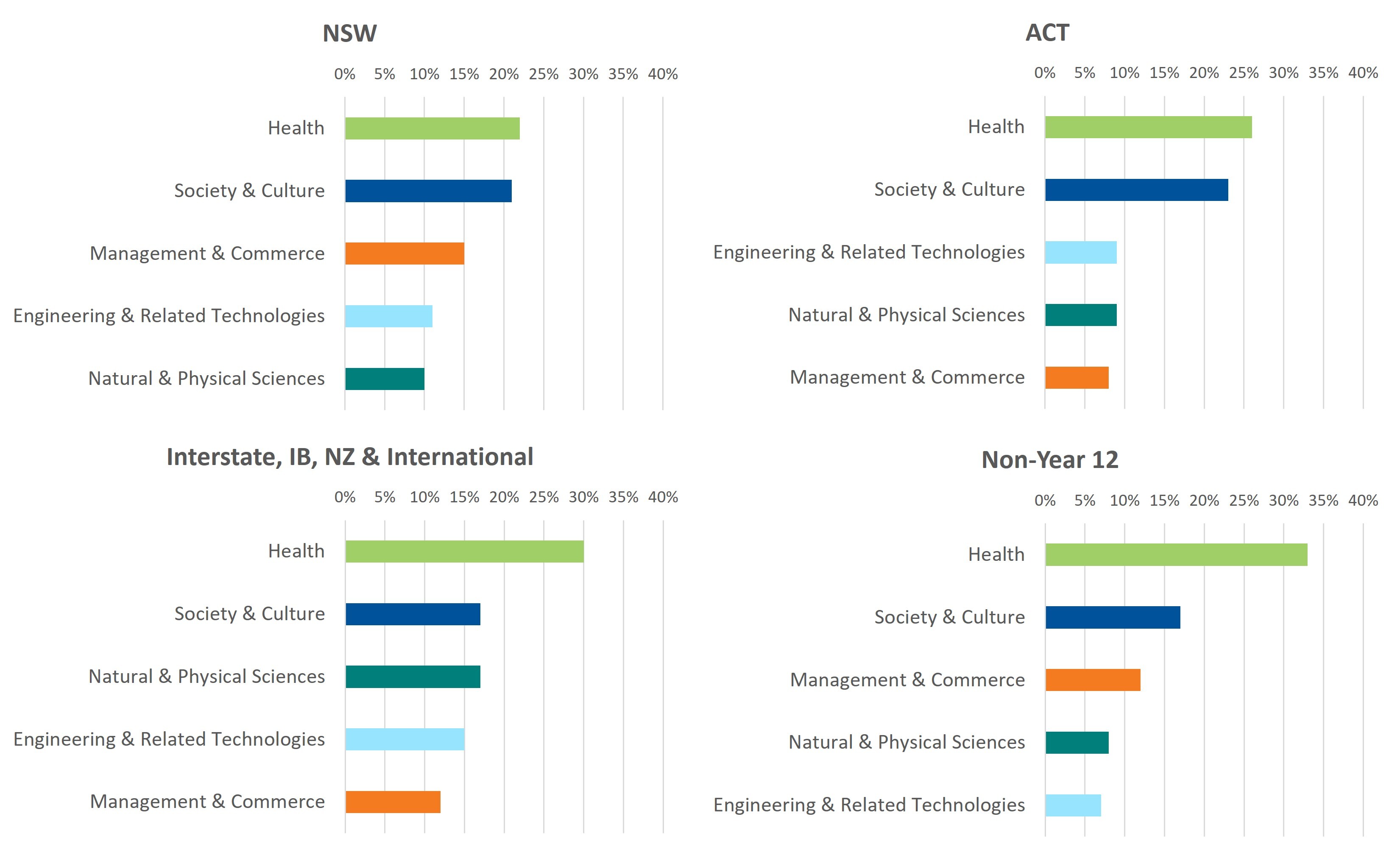 The top five fields of study listed as first preferences by NSW and ACT Year 12 applicants were similar. Both groups had most first preferences in Health and Society & Culture.